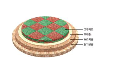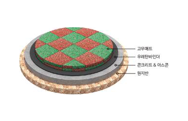 폐타이어 칩, 재활용 고무, EPDM 등 고무를 분쇄하여 일정 크기로 만든 후, 성형기로 압착 및 적절한 온도를 가하여 만든 충격흡수용 제품이다.
