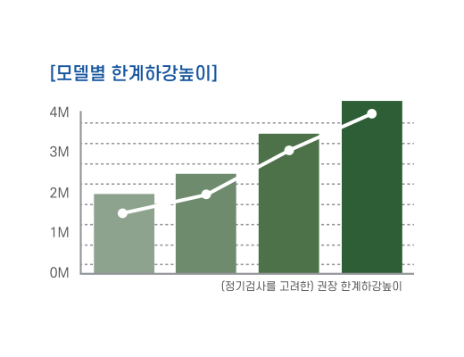 한계하강높이란? 충격흡수바닥재 표현에 사용자의 수직낙하를 사정하여 모델링된 시험을 통해 충격흡수용 표면재의 적절한 충격 감쇠 효과를 확인하는 지표로서, 머리상해기준치(Head Injury Criteria, HIC) 1000에 상응하는 최대수직 높이를 말한다. 한계하강높이가 높다고 하여 제품의 품질이 좋은 것은 아니므로, 일정 수준 이상의 강도와 굴곡변형 물성을 고려하여야 한다. 그래프는 참고용으로 현장 여건(기온, 습도, 기층의 종류, 강도 등)에 따라 달라질 수 있음.