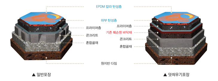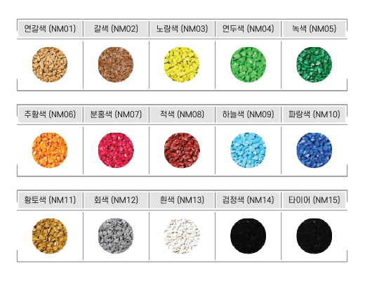 EPDM은 Ethylene, Proppylene, Non-conjugated Diene으로 이루어진 합성고무로 내오존성과 내한성, 내열성, 내용재성이 뛰어나고 색안정성이 좋아 다양한 색상이 요구되는 탄성포장재로 널리 사용되고 있다. 합성고무중 비중이가장 낮은 경제성이 뛰어난 합성고무로 유럽 및 일본에서 널리 사용되는 탄성포장재입니다.