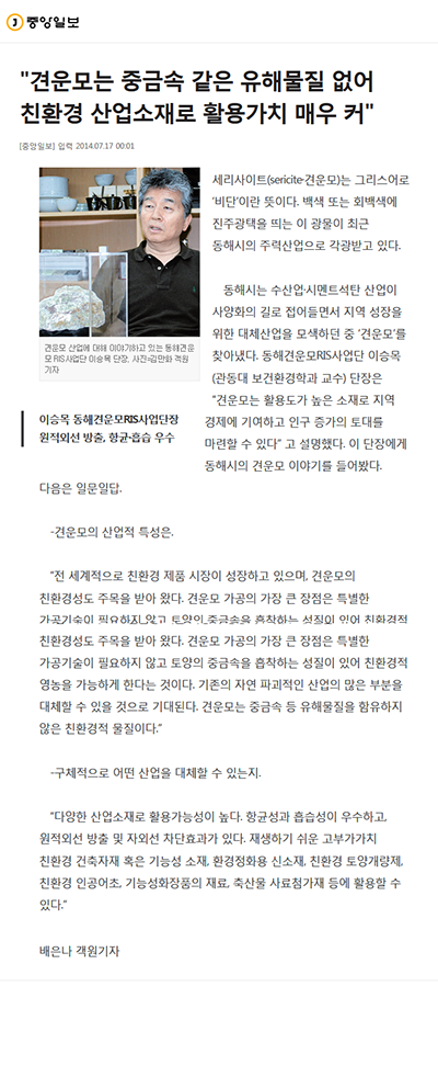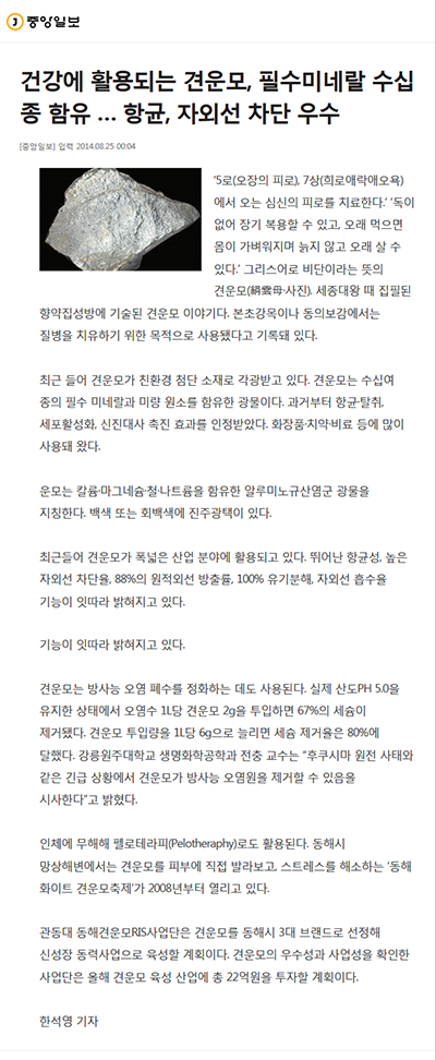 운모(雲母)라는 이름을 살펴보면 높음을 비유한 구름 운(雲)자와 어미 또는 할미를 뜻하는 모(母)자가 결합된 단어로서이는 지고지순(至高至純)한 즉, 숭고(崇高)한 사랑(母性愛)을 가진 우리들의 어머니(할머니)상을 연상 할 수 있습니다. 강원도에서 주로 생산되는 견운모(Sericite)는 40% 중량의 Al2O3, 48% 중량의 SiO2, CaO, MgO, Fe2O3, K2O, TiO2 등의화학 성분이 포함된 천연광물로 구성되어 있으며, 비늘 모양 및 판상구조의 다공 질 입자구조로 되어있어 물리적으로유기물질을 흡착, 흡수 하는 흡착력이 뛰어나고, 게르마늄이 191 mg/kg 으로 최상급 품위의 함유량 과 원 적외선의 방사량이 타 광물보다 월등하게 우수한 천연 광물로 평가 받고 있습니다.